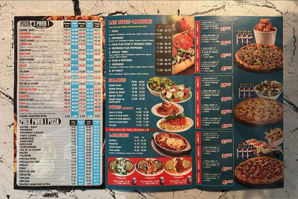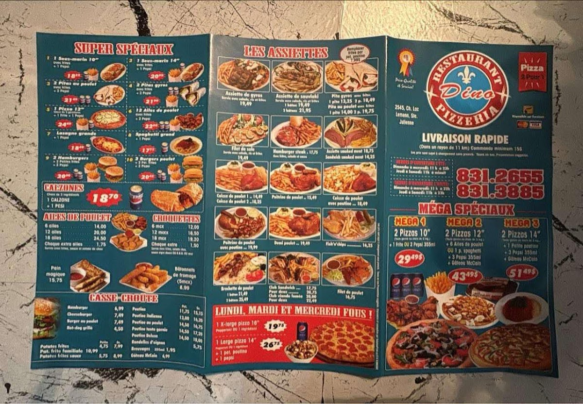 From a reviewer’s perspective, the menu at Restaurant Dino Ste Julienne offers a satisfying snapshot of classic, comfort-driven flavors that clearly aim to please a wide range of appetites. The highlight of the menu is the Pizza 2 Pour 1, a great value option that showcases the restaurant’s strength in traditional pizza combinations such as Pepperoni, Pepperoni & Bacon, Toute Garnie Quebecoise, and Hawaienne-each appealing in its own way, from smoky and savory to sweet and balanced. Beyond pizza, the “Others” section adds depth and variety, featuring hearty and indulgent choices like Steak Plus Steak Et Fromage Fondu, which leans into rich, melted cheese and robust flavors, as well as Pepperoni Plus Pepperoni, clearly designed for true pepperoni lovers. Options such as Steak & Pepperoni and Au Poulet further expand the menu by combining familiar proteins with bold seasoning, reinforcing the restaurant’s focus on generous portions and crowd-pleasing recipes. Overall, the menu at Restaurant Dino Ste Julienne feels cohesive and straightforward, emphasizing recognizable dishes, satisfying combinations, and strong value-making it an appealing choice for casual dining, family meals, or anyone craving classic pizza and comfort food done right.